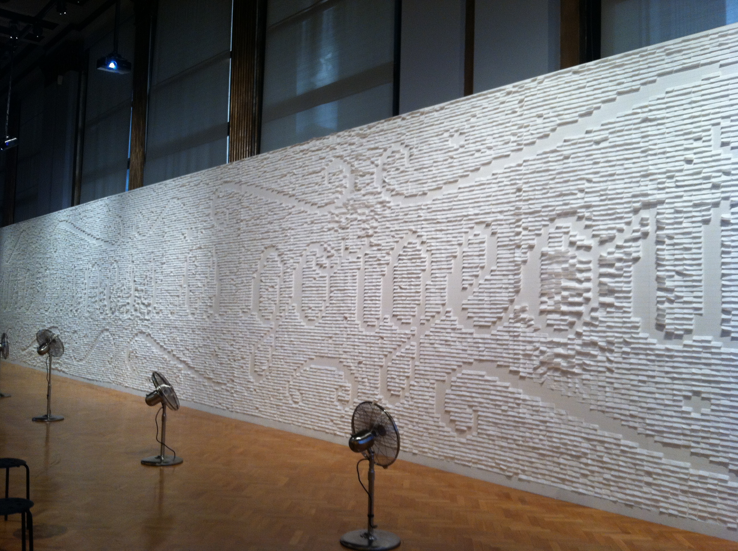 One of the highlights is a piece (shown above) created out of white post-it notes that – when oscillating fans blow the post-its – spells out Uselessness is Gorgeous.