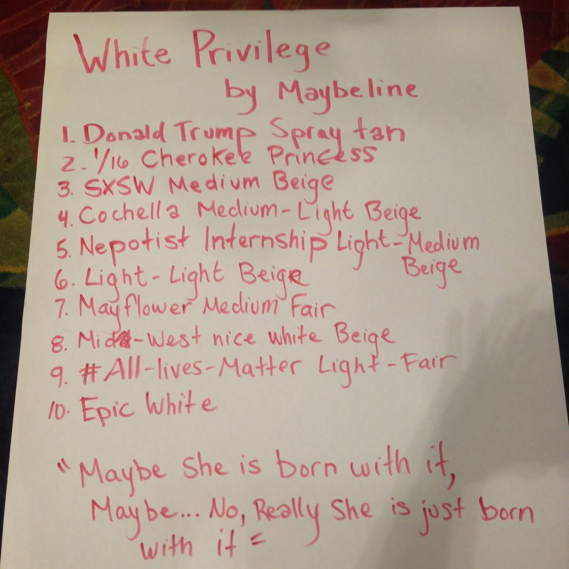 Image of our workshop group’s imaginary White Privilege Line of makeup.