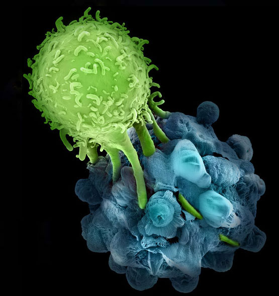 Image source here of a  T-lymphocyte (green) attacking a cancer cell (blue.)