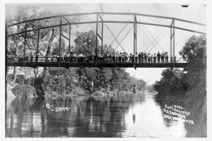 Image of the lynching of Laura and L.D. Nelson on a railroad bridge in 1911 in Oklahoma.