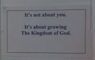Lower image is the (blurry) sign on my office door wherever I’m serving:  It’s not about you; it’s about growing the kingdom of God.  I need to remind myself.