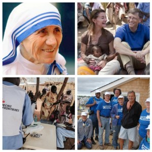 Mosaic of (clockwise from top left) Mother Teresa, Melinda and Bill Gates, a team of Presbyterian Disaster Assistance volunteers, and Doctors Without Borders workers.