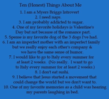A friend and colleague shared with me yesterday that as her daughter and son-in-law were “dating” an ocean apart from each other, they regularly shared “Ten (Honest) Things You Should Know About Me” lists. Although they’d only briefly hung out after first meeting, by the time they saw each other a second time, they felt like they knew each other pretty well.