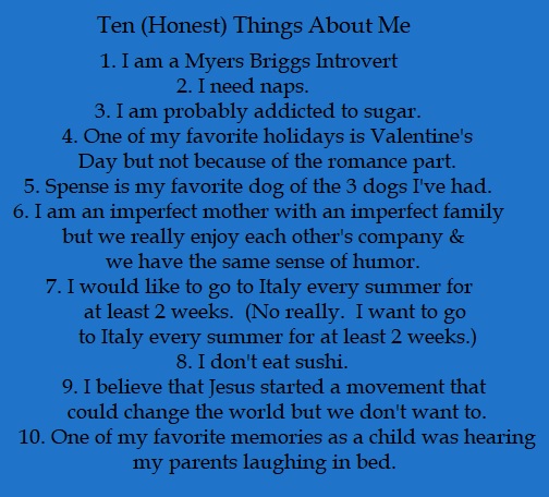 A friend and colleague shared with me yesterday that as her daughter and son-in-law were “dating” an ocean apart from each other, they regularly shared “Ten (Honest) Things You Should Know About Me” lists. Although they’d only briefly hung out after first meeting, by the time they saw each other a second time, they felt like they knew each other pretty well.