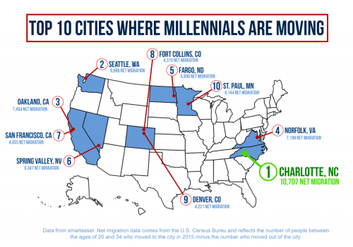 This stat comes from the 2015 U.S. Census Bureau which rated Charlotte with a 10,707 net migration figure for people between the ages of 20 and 34. Net migration = the # of Millennials who moved into Charlotte minus the # of Millennials who moved out.