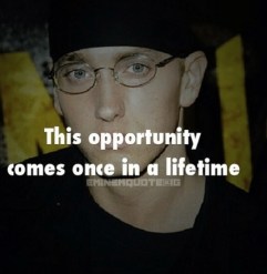 You better lose yourself in the music, the moment. You own it. You better never let go. You only get one shot. Do not miss your chance to blow. This opportunity comes once in a lifetime. Lose Yourself by Eminem