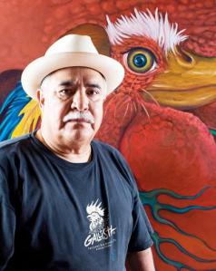 Image of the painter Joe Lopez standing with one of his works from The Gallo Series.  You can read his story here.
