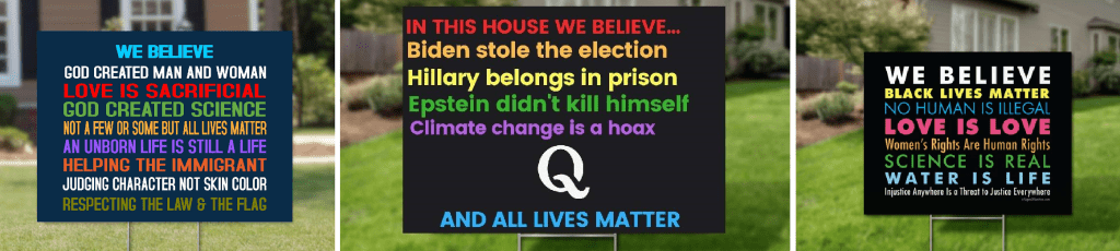Good for us if we want to change the world. I’m going to assume for a moment that people place these kinds of signs in their yards to express all kinds of things: anger, hope, frustration. Or maybe they are trying to pick a fight. Or maybe they are trying to fit into their neighborhood.