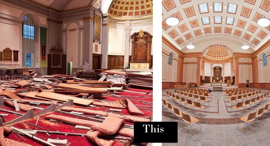 - Tear down your mold-filled building with no elevator or sprinkler system and replace it with whatever space in needed for the new ministries you’ll be doing in 2025 (because your rolls are filled with people who no longer live in the neighborhood and they might not be alive in 2025 but all kinds of new folks are moving into the area who seem to need childcare, financial education, job training, grief support, Christian education, affordable meals, friends, tutoring, or all the above lovingly offered in the name of Jesus. Note: Don’t assume what the neighbors need. Ask.
