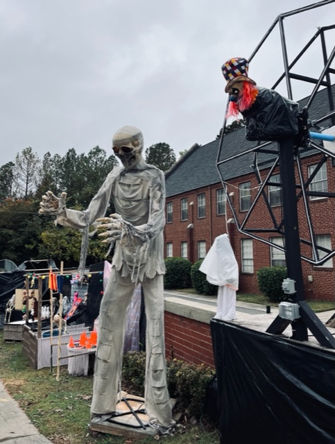 Pictured above is just a corner of the Halloween House in our current neighborhood. It’s a Zombie Carnival theme replete with a ferris wheel of creepy dolls and a 12 foot tall skeleton in front of a red-striped circus tent. The man who lives there has been working on his masterpiece for over a week now.